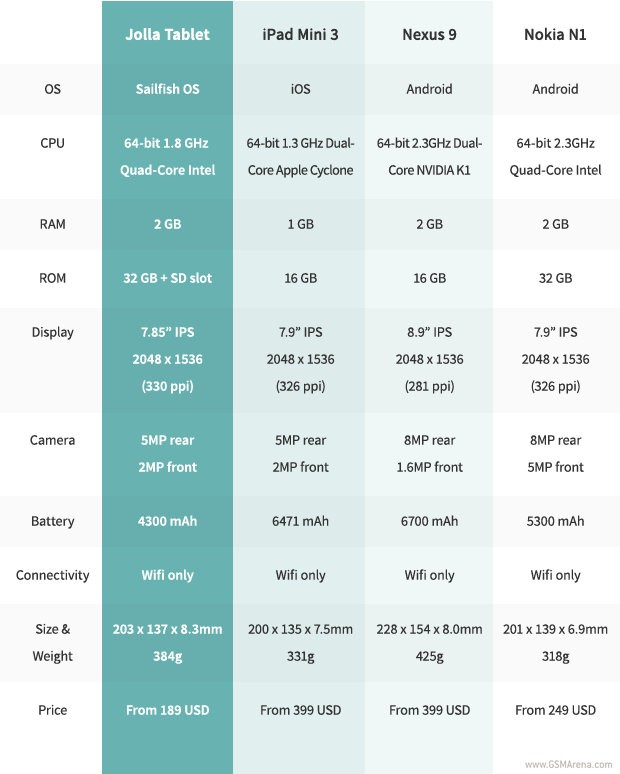 Работать новинка будет под управлением мобильной операционной системы Sailfish 2.0, созданной на базе платформы MeeGo и совместимой с ОС Android. Среди спецификаций Jolla Tablet значатся также 7.85-дюймовый IPS-дисплей с разрешением 2048х1536 точек, плотность пикселей на дюйм 330, 64-битный 4-ядерный процессор от Intel с тактовой частотой до 1.8 ГГц, 2 ГБ оперативной памяти, Flash-накопитель на 32 ГБ и поддержка карт памяти формата microSD максимальным объемом до 32 ГБ.