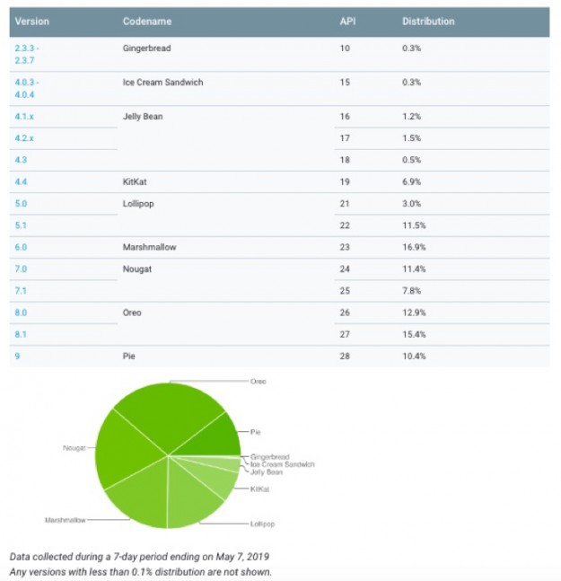 В эти дни проходит конференция Google I/O, на которой, помимо всего прочего, говорят об Android Q (она же Android 10), которая во второй половине года придет на смену Android 9 Pie. А как там дела у самого «пирога»? Ответ на этот вопрос дает новый рейтинг популярности разных версий Android, который обновился впервые с октября прошлого года. Он продемонстрировал, что только каждый десятый (10,4%) из миллионов Android-смартфонов работает на «девятке». Напомним, первыми ее получили устройства семейства Pixel еще в августе 2018 года.