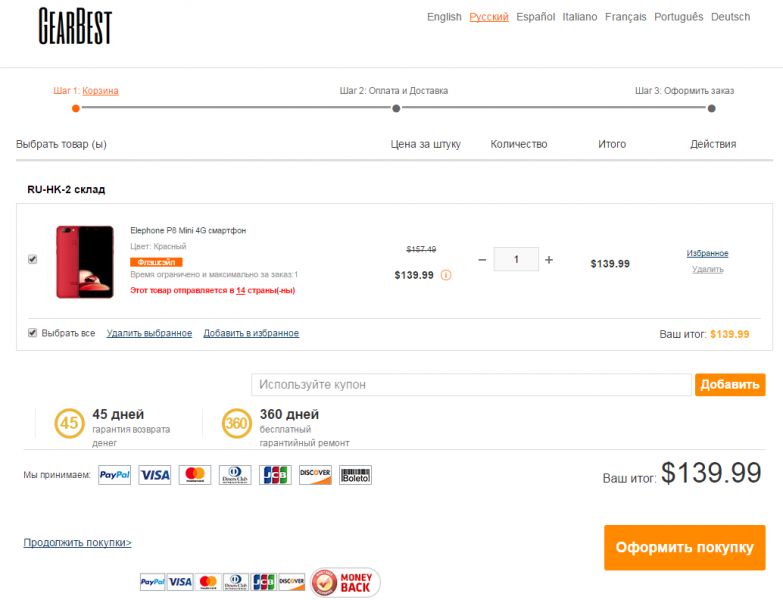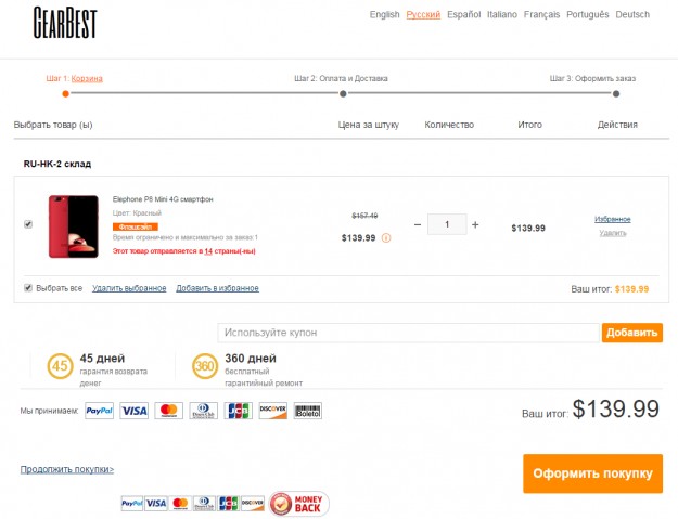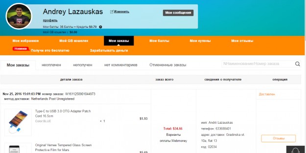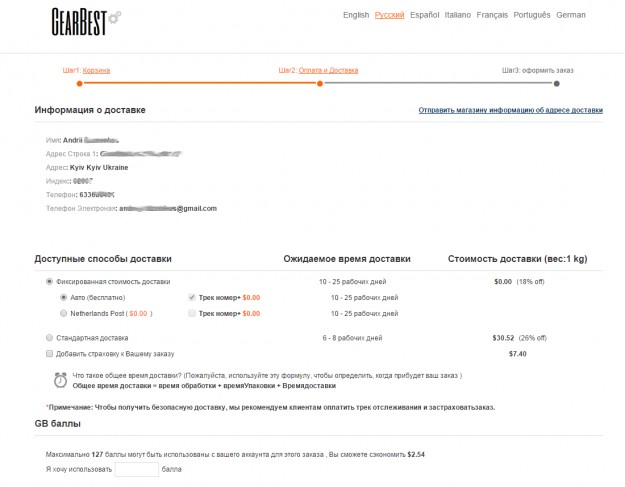 Как покупать на GearBest.com?GearBest.com является одним из самых крупных китайских международных интернет-магазинов, ориентированных на продажу современных электронных гаджетов, бытовой электроники, аксессуаров для автомобилей, атрибутов для спорта и дома, часов и даже одежды. Здесь регулярно появляются самые ожидаемые новинки китайских брендов, поэтому количество покупателей с каждым днем неуклонно растет. И Вы можете стать одним из них. В этой статье мы расскажем, как купить товары на GearBest.com с доставкой на Ваш адрес в Украину. Во-первых, отметим, что магазин поддерживает русский язык и все меню, включая корзину понятно и переведено правильно. Итак, сперва ищем на сайте GearBest.com интересующий нас товар, знакомимся с его техническими характеристиками, выбираем цвет, если таких предусмотрено несколько, указываем количество единиц и кликаем на кнопку «Добавить в корзину». Далее программа переводит нас в «Корзину», где можно удалять выбранные товары, изменять их количество, а также вводить промокод для скидки, если таковой имеется. Для продолжения покупки нажимаем «Оформить покупку» — на этом этапе необходимо будет также зарегистрироваться, введя свой email и придумав пароль (возможен вариант регистрации через аккаунт Facebook или Google). После этого выбираем вариант оплаты. Можно платить картой, а можно Webmoney и еще десятком враиантов. После регистрации пользователь получает на свой счет приятный бонус в виде 10 GB очков, что равнозначно $0.20. Эти деньги будут отображаться в Личном кабинете на сайте GearBest.com и их можно будет использовать для оплаты покупки. При регистрации доступны и промо-коды на покупки. Также их можно искать на сайте или получать в рассылке, если вы на нее подписались. Это выгодно делать, так как разнообразные распродажи проходят в течении всего года. Начисляет очки своим клиентам магазин не только за успешную регистрацию, но и за каждый приобретенный ими на сайте GearBest.com товар или написанный к нему отзыв/обзор. Но вернемся к заказу. Следующим действием будет заполнение адресного бланка доставки «Адрес доставки» на английском языке. Заметим, что на Gearbest.com действует бесплатная международная доставка через ряд почтовых компаний, в частности NL, SG, HK и почту Швейцарии. Из важных нюансов - при сумме покупки свыше $40 покупатель бесплатно получает трек-номер для отслеживания перемещения посылки, если стоимость товара менее $40 за трек-код нужно будет доплатить $1.99. Помимо раздела «Мои баллы», в котором накапливаются очки за покупки и текстовые обзоры товаров, в Личном кабинете пользователю доступна вкладка «Избранные», где собраны все понравившиеся вам товары, «Мои заказы» со списком всех приобретенных вещей, «Мои купоны» с перечнем заработанных в различных конкурсах промокодов, а также ««Мой GB кошелек» - данные внутренней платежной системы магазина Gearbest. Что ж, как видите, делать покупки на http://www.gearbest.com не только просто, но и выгодно за счет множества приятных бонусов в виде все тех же промокодов или дополнительных очков. Главное правильно оформить заказ и указать точный адрес доставки. Советуем попробовать оформить заказ прямо сейчас! Начните с главной страницы: GearBest.com! Джерело: SmartPhone.ua Обговорення новиниКоментариев пока никто не оставил. Станьте первым! Попередні новини