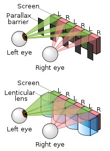 Другой способ — вместо решетки используются специальные линзы (лентикулярные). Если смотреть на массив из таких линз под разными углами, то различные участки изображения увеличиваютсяпо-разному. Это дает возможность для одного глаза показать один ряд пикселей и скрыть другой. Этот способ дает больший угол обзора. На момент изучения темы удалось найти несколько смартфонов с функцией воспроизведения3D-контентаи записи 3D видео (для этого в смартфон встроены 2 камеры), возможно, существуют и другие: