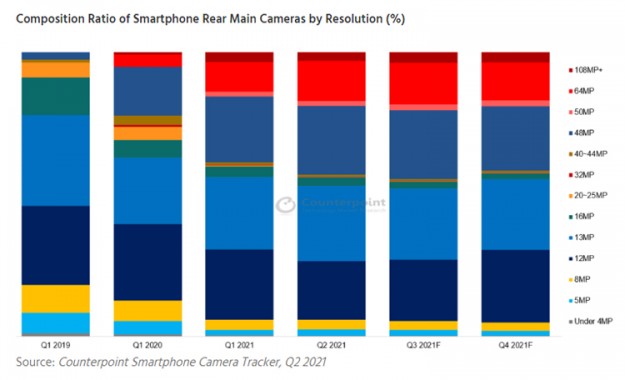 Камеры с разрешением 48 Мп и выше используются в 43 % смартфоновИсследование, проведённое компанией Counterpoint Technology Market Research, говорит о том, что разработчики смартфонов продолжают наращивать разрешение камер в своих устройствах. Не мешает этому даже глобальный дефицит электронных компонентов.