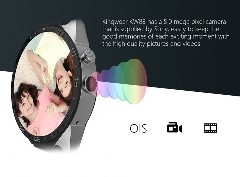 Предлагаемого аппаратного обеспечения достаточно для любого мультимедийного контента и приложений, который можно установить на KingWear KW88. Корпус красивый и продуманный. На правом торце размещена камера, а на левом динамик громкой связи. По части цветов, покупатель может выбрать вариант с черном металле, в цвет розового золота, серебра и возможностью выбора между черным, белым и красным ремешком (ширина ремешка – 26 мм). Так, что эти смарт-часы действительно хороши.