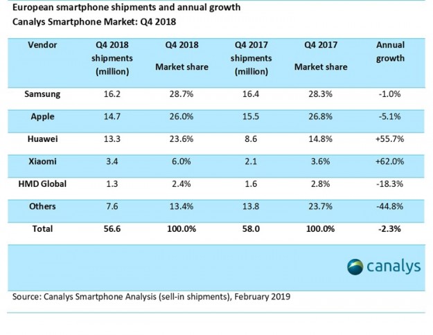 Компания Canalys обнародовала результаты исследования европейского рынка смартфонов в последней четверти и 2018 году в целом.