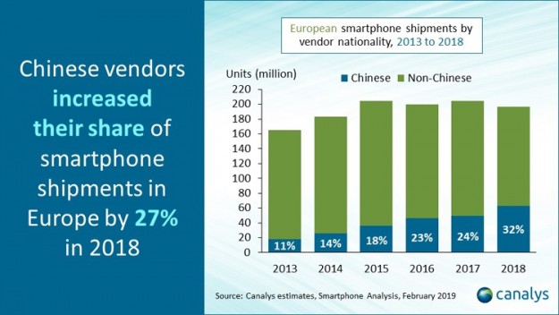 Аналитики Canalys говорят, что на рынок смартфонов Европы наступают китайские бренды. Их суммарная доля достигла рекордного значения в 32 %. Иными словами, аппараты из Поднебесной заняли треть европейского рынка.