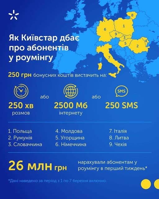 Київстар турбується про кожного абонента, який через війну виїхав за кордонМи турбуємося про кожного абонента, який через війну виїхав за кордон. Тому розширили перелік країн, де ви можете отримати бонусні кошти для спілкування у роумінгу. Окрім Польщі, Румунії, Словаччини, Молдови та Угорщини, віднині вони доступні ще й у Німеччині, Італії, Литві та Чехії.