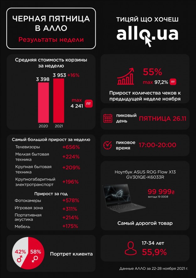Самые активные клиенты Черной пятницы – мужчины Во время Черной пятницы мужчины покупают в АЛЛО больше чем женщины: 58% по сравнению с 42% соответственно. Как в течение года, так и во время самой большой распродажи, клиентами АЛЛО является молодежь в возрасте 17-34 лет (55,9%). Самая большая активность покупателей пришлась на время 17:00-20:00 пятницы. Средняя стоимость корзины достигла 4 241 гривны Средний чек в АЛЛО постепенно увеличивался в течение недели и достиг максимума в пятницу – он составил 4241 гривну. При этом средненедельная стоимость корзины увеличилась по сравнению с прошлым годом: она составила 3 953 гривны за неделю, это на 16% больше чем в 2020 году. По данным АЛЛО, во время Черной пятницы клиенты покупают в основном дорогие товары, на которые действует большая скидка в гривневом эквиваленте. Самым дорогим товаром, купленном во время распродажи, стал Ноутбук ASUS ROG Flow X13 GV301QE-K6033R по акционной стоимости 99 999 гривен, скидка на него составила 19 000 гривен. Украинцы покупали телевизоры, электротранспорт, игровые зоны, гирлянды и товары для дома По сравнению с предыдущей неделей ноября 2021 года, во время акционной недели наиболее выросли продажи телевизоров – в 7,5 раз по объемам в гривнах, а также мелкая и крупная техника для дома – на 224% и 209% соответственно. Почти в два раза увеличился объем купленного крупногабаритного и малогабаритного электротранспорта. Среди купленных на Черную пятницу товаров – сезонные категории как гирлянды, искусственные елки и санки, а также множество разнообразных товаров со скидками: акустическая гитара, серебряные серьги, массажеры, алкоголь, продукты, товары для дома. По сравнению с акционной неделей прошлого года, в 2021 году наибольшего внимания покупателей получили фотокамеры – объем покупок вырос на 578%, и игровые зоны, которые выросли на 311%. Объем покупок портативной акустики увеличился в три раза, мебели – на 175%, а малогабаритного электротранспорта – на 76% по результатам недели. Джерело: SmartPhone.ua Обговорення новиниКоментариев пока никто не оставил. Станьте первым! Попередні новини