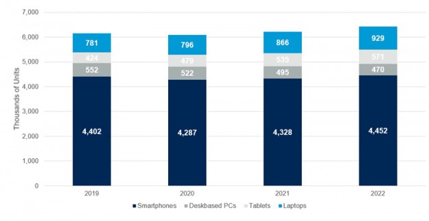 По оценкам, в прошлом году в глобальном масштабе в эксплуатации находились в общей сложности 6,08 млрд устройств указанных типов. Из них около 4,3 млрд составили смартфоны. На настольные ПК и ноутбуки пришлось соответственно 522 млн и 796 млн единиц. Ещё 479 млн — это планшеты.