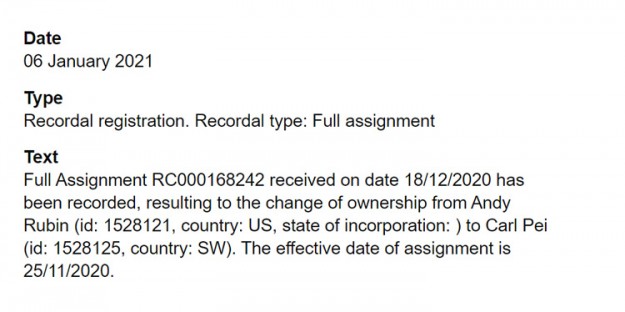 Об этом сообщил ресурс 9to5Google, обнаруживший в Офисе интеллектуальной собственности Великобритании (UK-IPO) документы, свидетельствующие о том, что бывший основатель Android Энди Рубин передал право собственности на свою фирму по производству смартфонов Essential компании Nothing Technologies Limited. Процесс передачи был завершён 6 января 2021 года, а фактически заявка была подана ещё 11 ноября 2020 года.