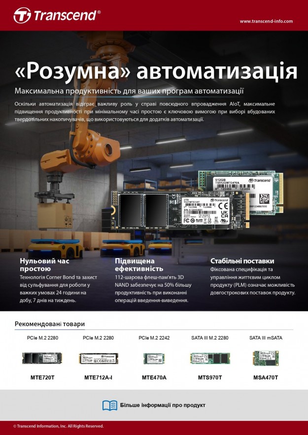 Компанія Transcend - провідний світовий виробник професійних вбудованих рішеньTranscend — провідний світовий виробник пам'яті та рішень для зберігання даних, що більше 30 років займається створенням споживчих товарів і більше 15 років – професійними рішеннями. Продукція бренду успішно застосовується в різних сферах людської діяльності – системах управління транспортом, охороні здоров'я, хмарних обчисленнях тощо. Завдяки цьому Transcend став одним з основних постачальників носіїв інформації у всьому світі. Продукція компанії активно використовується у промислових системах у різних країнах.