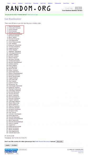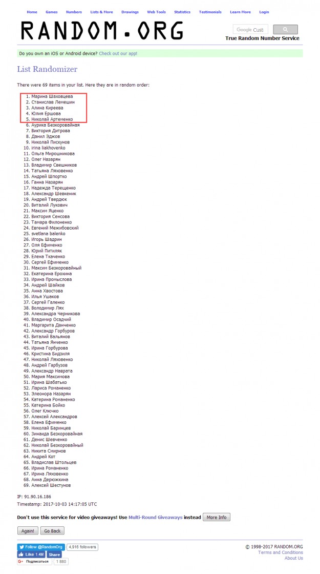 Правильные ответы на вопросы: Поздравляем и благодарим Всех за участие! С победителями, выигравшими комплекты батареек, представитель компании Panasonic свяжется в ближайшие дни. Джерело: SmartPhone.ua Обговорення новиниСтас: Со мной до сих пор не связался никакой представитель. Сколько еще ждать? Admin Мы попробуем уточнить. Если указали правильные контактные данные, то Вас обязательно должны были набрать на мобильный/почту. Напишите первые номер своего мобильного без двуз последних цифр. Тот номер, который Вы указали при ответах на вопросы. Стас: Не набирали и не писали. Номер телефона: 06796278**. Почта: russian-roulette... Admin Передадим информацию представителям Panasonic. Стас: Можете сообщить, что ответил представитель Панасоник, когда вы во второй раз передали ему данные? Потому что мне до сих пор никто не написал и не позвонил. Женя Советую проверить спам в своей почте. Мне в день розыгрыша написали на почту. Стас Интересно. И кто же из победителей Женя? "...Победителями конкурса... стали Марина Шаховцева, Станислав Лемешин, Алина Киреева, Юлия Ершова, Николай Артеменко". Admin Вы проверяли почту? Стас Конечно. И папку спама тоже. Попередні новини