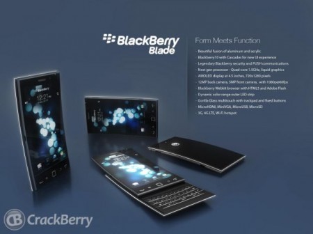 Пока одни фанаты BlackBerry с нетерпением ждут появления новых моделей смартфонов на базе новой операционной системы BlackBerry 10, некоторые дизайнерские компании подогревают интерес первых и создают новые концепты будущих устройств BlackBerry. Одним из таких последних концептов стал BlackBerry Blade, разработанный командой дизайнеров Pixelcarve из Торонто (Канада). Судя по приложенным спецификациям этот концепт является слайдером. Устройство предлагает вогнутый 4.5-дюймовый AMOLED дисплей с разрешением 720p и работает на базе четырехъядерного процессора с частотой 1.5ГГц. Устройство облачено в алюминиевый корпус, предлагает 12-мегапиксельную камеру с поддержкой записи видео в разрешение 1080p при 60 кадрах в секунду, фронтальную 5-мегапиксельную камеру, порты MicroHDMI, MicroVGA, MicroUSB, слот MicroSD и предлагает поддержку HTML5, Adobe Flash и 4G LTE.