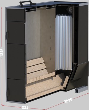 Котел длительного горения Брик – пиролизный котелКотел длительного горения – это котел пиролизного типа горения. Набирающая популярность конструкции газогенераторных установок характеризуется высоким КПД (коэффициент полезного действия). Такой принцип пиролизного горения существенно отличается от традиционного, классического сжигания дров или другого твердого топлива. Котел твердотопливный: классического типа горенияВ обычных котлах прямого горения дрова охвачены пламенем целиком (в полном своем объеме) и сгорают за короткий промежуток времени. При этом большая часть выделившегося тепла не успевает передаться теплоносителю и удаляется через дымоход в атмосферу. Температура исходящих газов, уносящихся через дымоходную вытяжную трубу, на столько высока, что представляют реальную опасность возгорания материалов, которые с ней контактируют. Котел долгого горения: пиролизный тип горенияПиролизный котел длительного горения работает таким образом: древесное топливо, которое находится в топке не горит, а тлеет при недостатке кислорода. Во время тления выделяется газ. Этот газ, насыщенный углеродом, попадая во вторую камеру котла (камеру горения пиролизного газа) - воспламеняется и сгорает с выделение большого количества тепла. Котел длительного горения БрикКотел длительного горения Брик – это пиролизный тип горения. КПД котла = 91%. Котел Брик сконструирован с большим запасом прочности и рассчитан на эксплуатацию даже в тяжелых промышленных условиях.