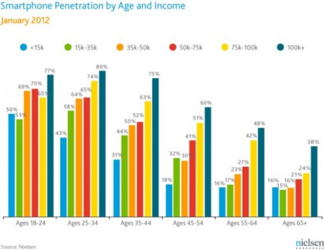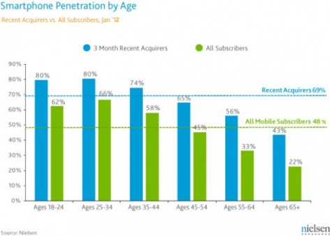 Умные телефоны давно уже пытаются вытеснить из обихода старые добрые “звонилки”, отправляющие смс и совершающие звонки. И уже ни для кого не удивителен тот факт, что обзаводится новыми модными девайсами в основном молодежь. Компания Nielsen не стала доверять общему мнению и провела собственное исследование, изучив потребительский рынок смартфонов и самих потребителей. Опросив 20000 владельцев мобильных телефонов в США, Nielsen обнародовала весьма интересные данные: 48% оказались пользователями “умных телефонов”, 66% из которых попали в возрастную категорию 25-34 года.