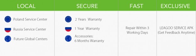 Недавно созданный Польский сервисный центр LEAGOO предоставляет локальные услуги клиентам LEAGOO из Европы. LEAGOO утверждает, что в ЕС неисправный смартфон может быть исправлен в течение 3 рабочих дней после получения, что является хорошей новостью для местных жителей, обеспокоенных проблемами с их смартфонами. И благодаря интеграции Польши в ЕС, доставка не является проблемой среди стран-членов ЕС. Пока что срок гарантии для клиентов LEAGOO Europe составляет 2 года.
