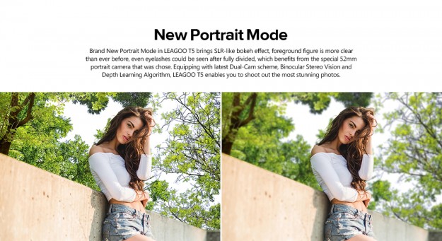 Совершенно новый портретный режим в LEAGOO T5 позволяет добиться эффекта съемки SLR камерой с красивым боке. В портретном режиме фигура на ближнем фоне более четкая, чем когда-либо прежде, даже ресницы можно рассмотреть. Это сравнимо со съемкой на фотоаппарат с объективом в 52 мм. Новая система Dual-Cam, бинокулярное стереоопределение и алгоритм обучения глубине в LEAGOO T5 позволяет владельцу снимать потрясающие фотографии.
