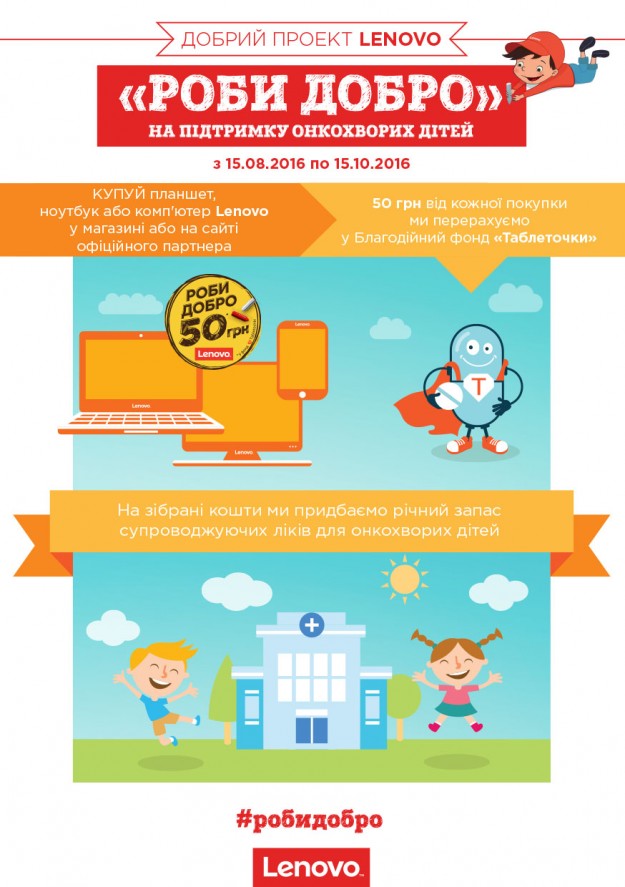 Lenovo: Делай добро вместе с LenovoВ Украине стартовал добрый проект от Lenovo «Роби добро» в поддержку онкобольных детей. С 15 августа по 15 октября 2016 года приобретая любой планшет, ноутбук или компьютер Lenovo по обычной цене, вы помогаете ребенку стать здоровым. С каждой покупки будет перечислено 50 грн в фонд «Таблеточки», чтобы закупить необходимые сопровождающие медикаменты для детей-пациентов Охматдета.