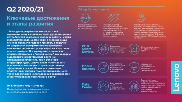 "Рекордные результаты этого квартала отражают нашу нацеленность на удовлетворение потребностей каждого в условиях работы, учебы и развлечений дома. Все наши основные виды бизнеса показали годовой прирост, а выручка от разработки программного обеспечения и оказания сервисных услуг выросла и достигла нового рекорда. Поскольку мир продолжает приспосабливаться к "новой норме", мы уверены в долгосрочном потенциале роста как направления устройств, так и облачной инфраструктуры. Lenovo будет использовать основные компетенции ? производственную эффективность и глобальное и локальное присутствия, ускоряя трансформацию бизнеса услуг для лучшего использования возможностей и стимулирования устойчивого роста" ? комментирует Ян Юаньцин (Yang Yuanqing), председатель совета директоров и генеральный директор Lenovo. Экономические перспективы В 2020 году множество отраслевых факторов, включая геополитическую неопределенность, глобальную пандемию COVID-19 и дефицит поставки комплектующих, обусловленный высоким спросом, продолжают влиять на поставки и производство. Однако, Lenovo видит положительные перспективы на вторую половину года. Ведь "новая норма" работы, учебы и развлечений дома определяет долгосрочные тенденции роста спроса на устройства и формирует высокие требования к облачным и инфраструктурным решениям. Бизнес-группа ожидает, что общий рынок ПК вырастет за рамки текущих прогнозов и приблизится к 300 млн устройств в 2020 календарном году, что примерно на 25 млн больше прошлогоднего объема рынка. Обзор бизнес-группы Подразделение Intelligent Devices Group (IDG) демонстрирует высокие показатели эффективности. Рекордная выручка группы PC and Smart Devices (PCSD) составила $11,5 млрд, что на 8% больше аналогичного периода прошлого года. Группа сообщает о рекордном доходе до налогообложения в размере $723 млн, показав рост на 18% год к году, и лидирующей в отрасли марже прибыли на уровне 6,3%. Операционные возможности Lenovo, своевременное реагирование на тренд удаленной работы и учебы, а также фокус на премиальных продуктах и быстро развивающихся сегментах обеспечили рекордную эффективность ежеквартально. Lenovo ? лидер на мировом рынке ПК с долей рынка 23,6%. Второе бизнес-подразделение IDG, Mobile Business Group (MBG), сообщает о квартальном увеличении выручки на 39%. Подразделение вернулось к тенденции ежегодного роста, продолжая уверенное восстановление после воздействия COVID-19. Рост на рынках в Латинской Америке и Северной Америке еще больше укрепился, тогда как в Европе и Азиатско-Тихоокеанском регионе ? ускорился. Во втором квартале также произошли ключевые шаги компании по запуску смартфона с гибким экраном ? razr 5G и первого игрового смартфона под брендом Lenovo Legion. Компания и в дальнейшем будет использовать широкое портфолио продуктов и инновации 5G, чтобы обеспечить прибыльный рост в будущем. Подразделение Data Center Group (DCG) продолжает демонстрировать рост и улучшать прибыльность. Выручка увеличилась на 11% в годовом сопоставлении и достигла $1,48 млрд. Направление поставки облачных услуг (Cloud Service Provider) продолжило расти во всех регионах, увеличив доход на 34% год к году. В основе этого результата лежат постоянные инвестиции Lenovo в разработку и производство собственных продуктов, что привело к значительному успеху в дизайне материнских плат и систем. Выручка направления Enterprise and SMB business практически н