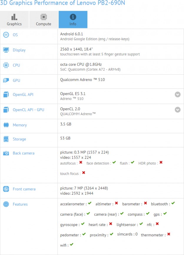 Lenovo готовит к анонсу 18.4-дюймовый планшетВ базе данных бенчмарка GFXBench был замечен новый планшет компании Lenovo с ОС Android 6.0.1 Marshmallow "из коробки" и 18.4-дюймовым дисплеем. Исходя из утечки, можно предположить, что Lenovo PB2-690N, как и прошлогодний Yoga Home 900, будет принадлежать к классу устройств "моноблок-планшет". Его аппаратная составляющая, если верить данным тестера, будет представлена 8-ядерным процессором от Qualcomm с тактовой частотой 1.8 ГГц, графическим чипом Adreno 510, 4 БГ оперативной и 64 ГБ встроенной. Разрешение экрана составит 2560x1440 пикселей.