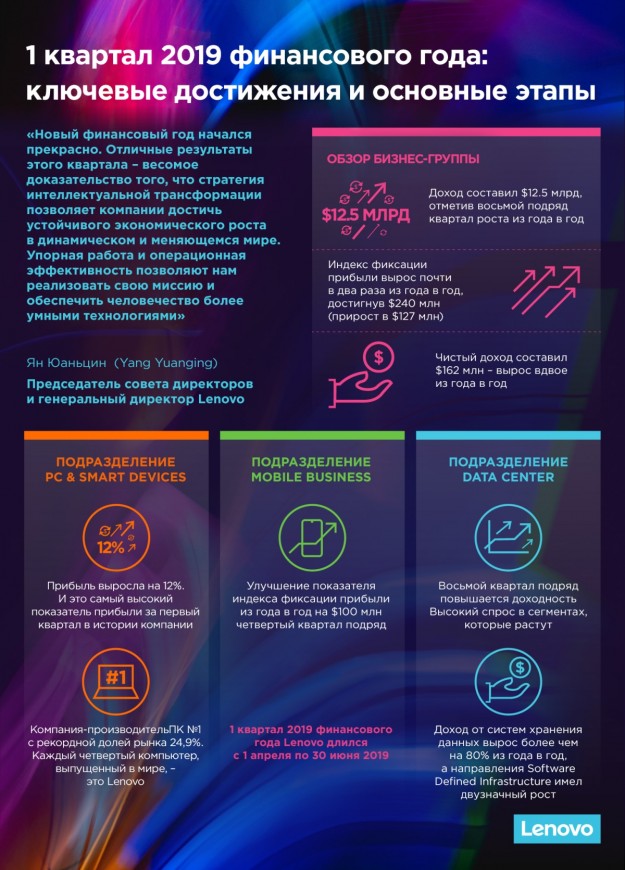 На рынке ПК, который восстанавливается, объем вырос более чем на 13 пунктов. Группа достигла рекордной доли рынка ПК – 24,9%. Это означает, что каждый четвертый ПК в мире – компьютер Lenovo. Это укрепляет позиции Lenovo как мирового лидера в производстве ПК. Значительные финансовые результаты обусловлены комбинацией инноваций, портфелем продуктов, созданным с учетом мнения клиентов, и фокусом на операционной деятельности. Эта стратегия позволяет компании расти быстрее, чем рынок, как в быстро развивающихся, так и премиальных , включая: рабочие станции, ультрабуки, устройства с мощной графикой, игровые ПК и хромбуки. PCSD и в дальнейшем сосредоточится на премиальных сегментах, внедряя инновации в повседневные и смарт-устройства для бизнеса, а также разрабатывая новые устройства для дома и офиса. Второе бизнес-подразделение IDG, Mobile Business Group (MBG), показало еще один прибыльный квартал и увеличило прибыль до налогообложения на $100 млн уже четвертый квартал подряд. В Северной Америке объем рынка вырос более чем на 37 пунктов, а рентабельность до вычета налогов увеличивается более чем на 14 пунктов из года в год. Подразделение Data Center Group (DCG) повышает рентабельность уже восемь кварталов подряд. Выручка от систем хранения данных выросла более чем на 80% из года в год, а направление Software Defined Infrastructure (SDI) имеет двузначный рост год к году. Общий доход снизился, поскольку незначительное количество крупных заказчиков облачных решений уменьшили объемы закупок после быстрого роста инфраструктуры в течение прошлого года, а также из-за снижения выручки вследствие снижения цен на компоненты. В сегменте высокопроизводительных вычислений (HPC) компания вышла на первую позицию рейтинга ТОР500 суперкомпьютеров с 173 системами на 20 рынках, продолжая поддерживать передовые научные исследования во всем мире.