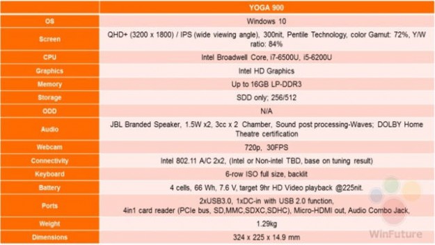 Новинка получит IPS-дисплей с разрешением 3200х1800 пикселей и яркостью в 300 нит, в зависимости от модификации процессор Core i5-6200U или Core i7-6500U, графический чип Intel HD Graphics, до 16 ГБ оперативной памяти и SSD-диском на 256/512 ГБ. Работать Lenovo Yoga 900 будет под управлением операционной системы Windows 10. Он будет оснащен модулем Wi-Fi 802.11ac 2x2, фронтальной камерой с возможностью записи видео в разрешении 720p с частотой 30 кадр/c, двумя портами USB 3.0, разъемом Micro HDMI и картридером 4-в-1 (SD, MMC, SDXC, SDHC).