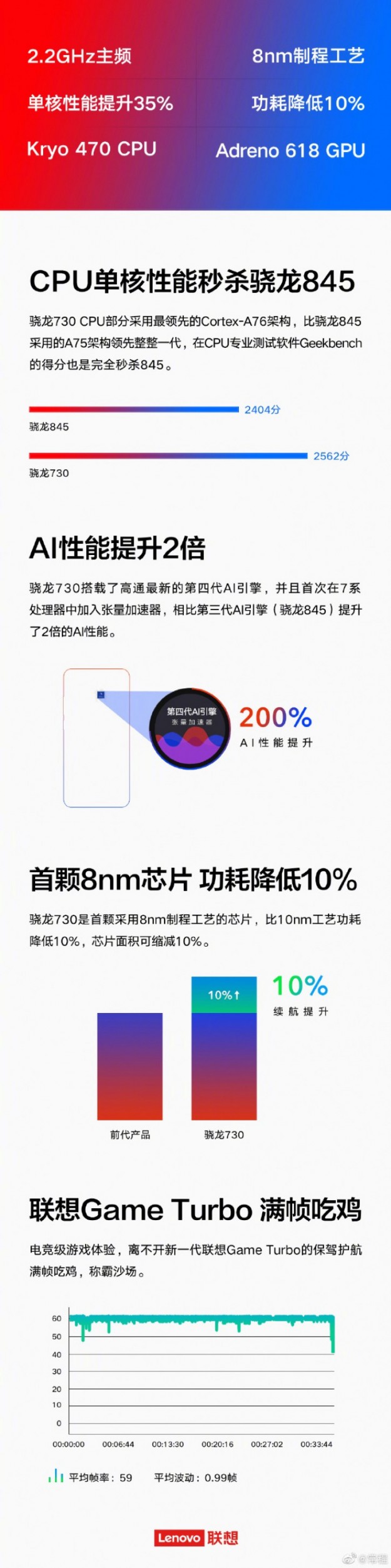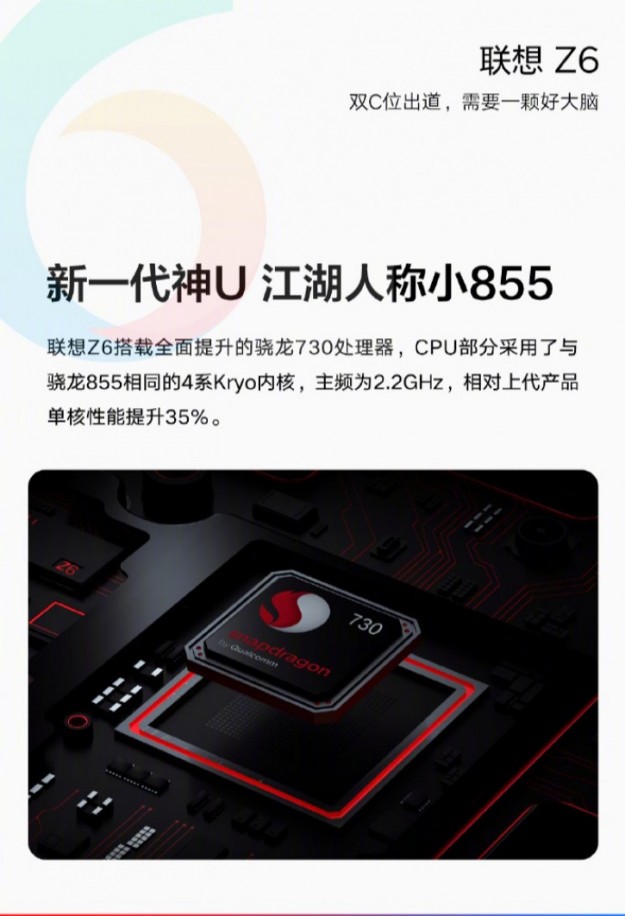 Lenovo Z6 станет конкурентом для Redmi K20Китайская Lenovo готовит еще один смартфон Z-серии, который дополнит флагман Lenovo Z6 Pro на Snapdragon 855 с тройной камерой. Руководитель китайской компании опубликовал в социальных сетях инфографику, которой подтвердил, что грядущий Lenovo Z6 будет построен на базе Snapdragon 730, а заодно и показал преимущества данного чипа перед прошлогоднего флагмана Snapdragon 845 по части производительности и искусственного интеллекта. Напомним, совсем недавно была анонсирована линейка Redmi K20, младшая модель которой также предложила Snapdragon 730. В России эта модель доступна под наименованием Xiaomi Mi 9T. Очевидно, Lenovo Z6 получит дизайн старшей версии и 48-Мп основную камеру. Анонс состоится в ближайшее время.