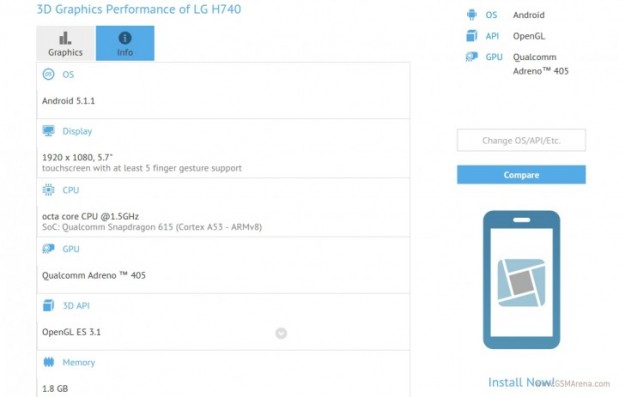 LG готовит к анонсу 8-ядерный фаблет на ОС Android 5.1.1На сайте популярного бенчмарка GFXBench был замечен новый фаблет южнокорейской компании LG с индексом H740. Среди спецификаций будущей новинки в тестере значится 5.7-дюймовый дисплей с разрешением 1920х1080 точек, 64-битный 8-ядерный процессор серии Snapdragon 615 от Qualcomm с тактовой частотой 1.5 ГГц и графикой Adreno 405, 2 ГБ оперативной памяти и 8 ГБ встроенной.