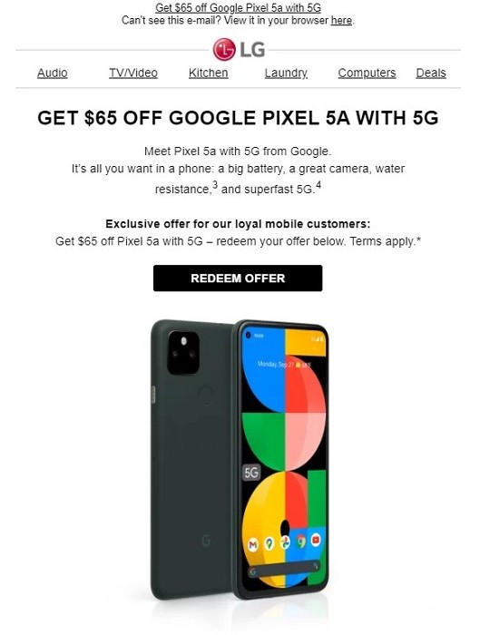 LG начала неожиданно рассылать скидочные купоны на смартфоны Google Pixel 5aКомпания LG, прекратившая выпуск собственных смартфонов этим летом, неожиданно начала рассылать «лояльным мобильным клиентам» коды на скидку в размере $65 при покупке гаджетов одного из бывших конкурентов. Со скидкой LG можно приобрести Google Pixel 5a в магазине Google Store.