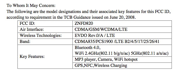 Смартфон с номером модели D820 получил поддержку сетей четвертого поколения LTE таких американских операторов сотовой связи, как AT&T, T-Mobile и Sprint, а также поддержку стандартов CDMA/EVDO rev A, DC-HSPA+ и GSM/EDGE. В наличии аппарата беспроводные модули Bluetooth 4.0, NFC и Wi-Fi 802.11 b/g/n/ac.