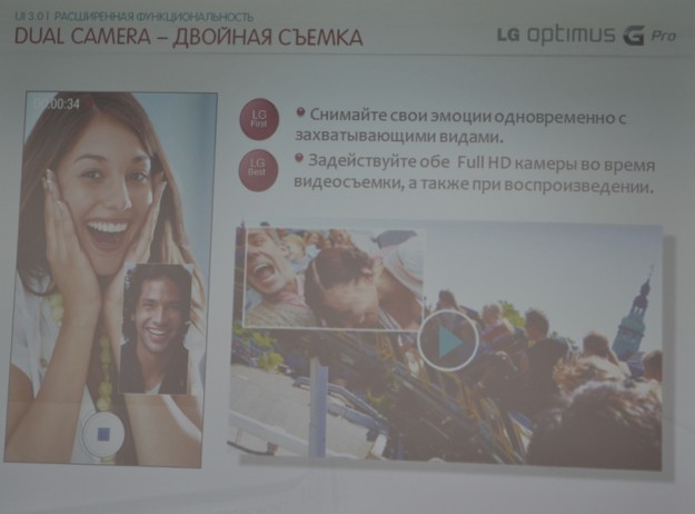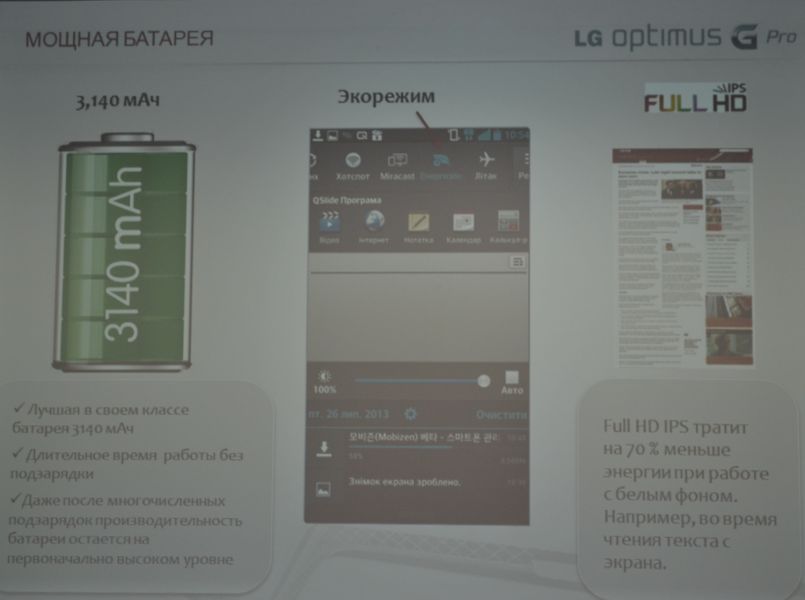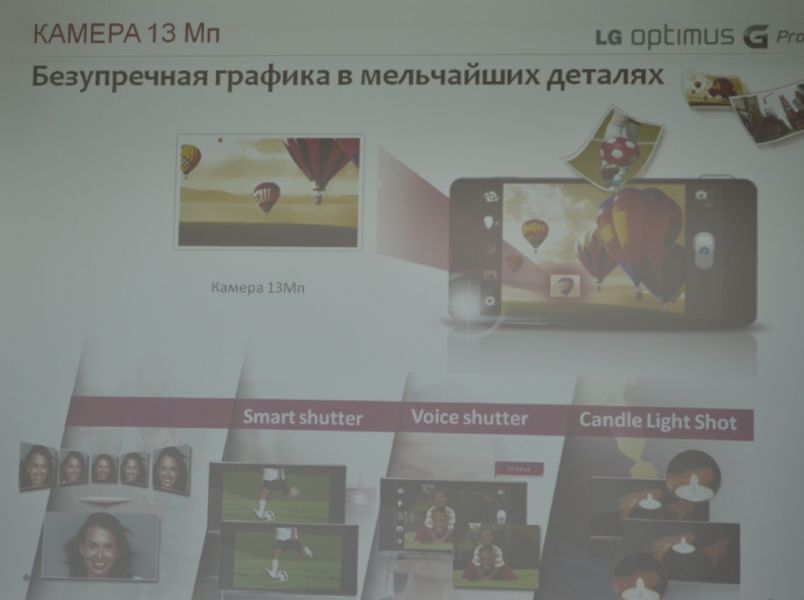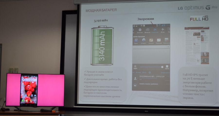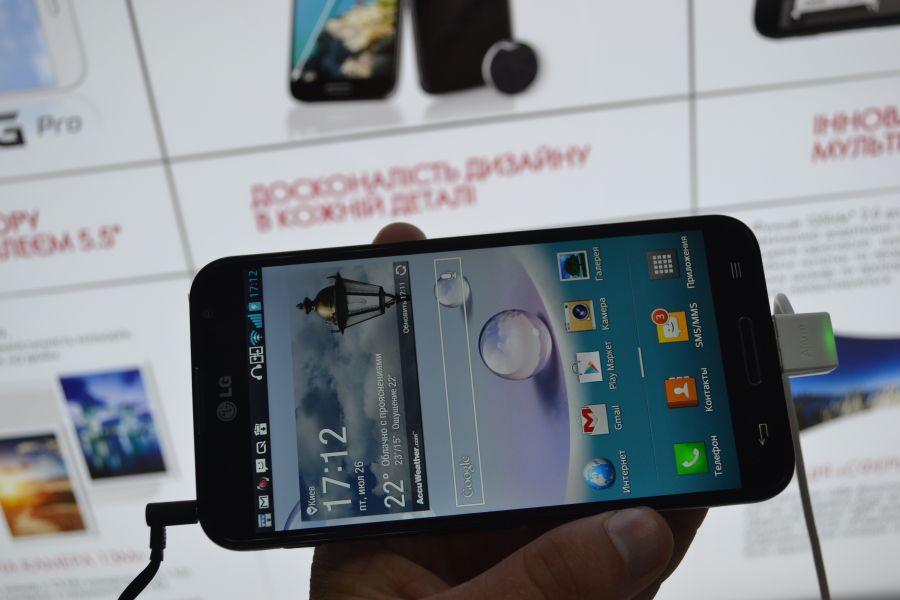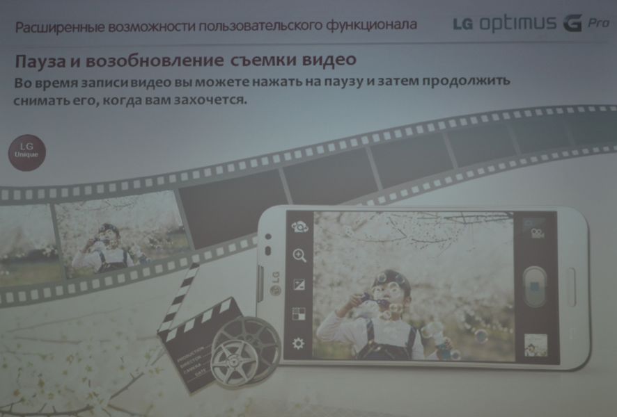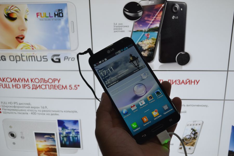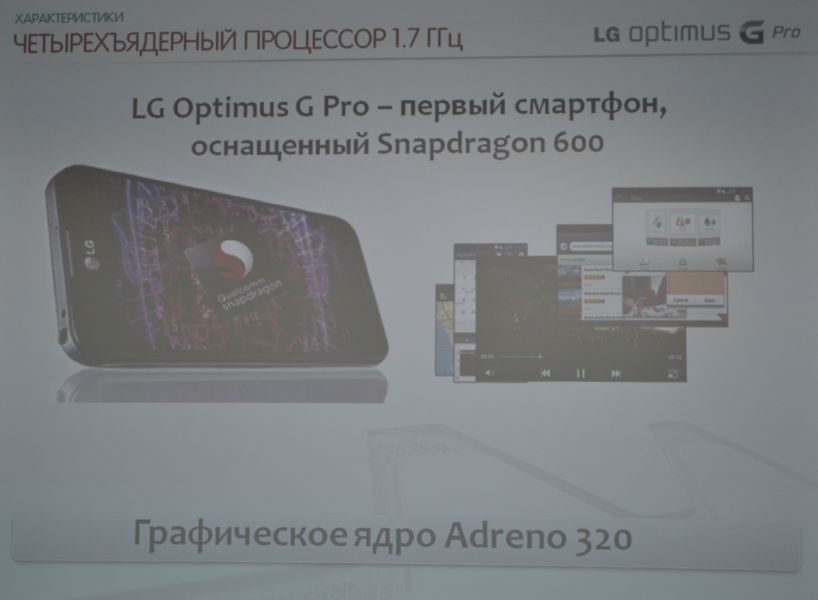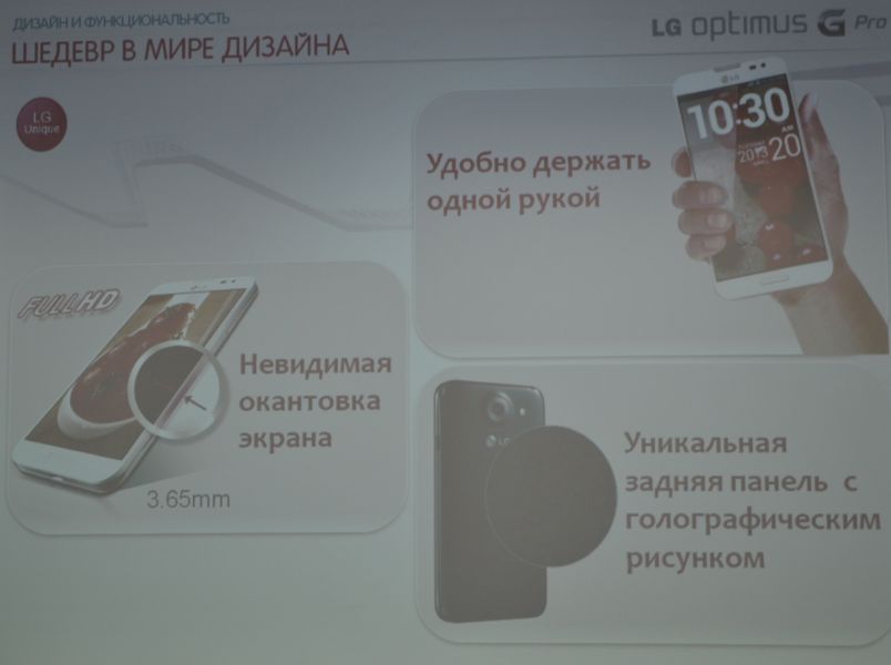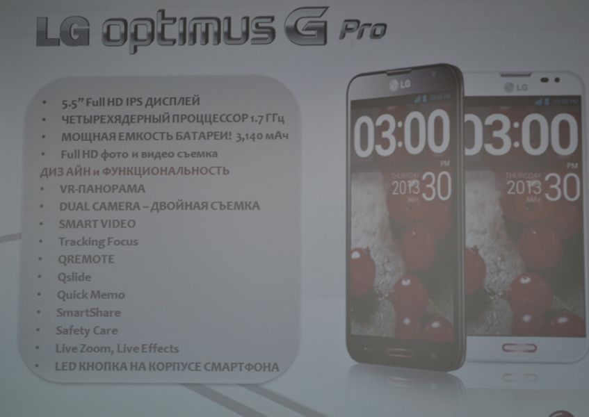 LG Optimus G Pro в Украине – краткий репортаж с презентацииВ прошлую пятницу украинский офис LG представил новый флагманский смартфон LG Optimus G Pro. Наши впечатления о новинке ниже. Презентация проходила в стенах киевского офиса компании. Помимо официальных лицна мероприятии собралось также несколько десятков представителей специализированных средств массовой информации и представители компании Rozetka. После небольшого вступительного слова президента LG Electronics Украина присутствующие смогли послушать детальный рассказ о модели и ее особенностях от продакт-менеджераLG Юлии Бесединой. Ниже несколько наглядных иллюстраций того, о чем шла речь. Также поведали и об аксессуарах, которые будут предлагаться к LG G Pro. После этого своим впечатлением от новинки поделились представители компании Rozetka Тарас Олейник и Николай Бриленко. Они также проинформировали присутствующих о том, что в ближайшие две недели анонсированный смартфон будет доступен на эксклюзивных правах в магазине Rozetka.ua по цене 5555 гривен. А вот в offline-рознице трубка появится через две недели, но будет почти на 500 гривен дороже – 5999 гривен. Словом, есть над чем задуматься! После официальных докладов, мнений, а также сессии «вопросы-ответы» присутствующие переместились к демо-стендам, где всем была предоставлена возможность познакомиться сновинкой ближе. Что понравилось и не понравилось на первый взгляд!? Лично мне кажется, что внешне трубкапроигрывает Optimus G (с обзором последнего знакомимся здесь). Да, трубка выглядит бойко, по-своему мощно, в некой мере стильно.… Но вместе с тем, давайте будем смотреть правде в глаза – G Pro выполнен в стилистике многих предшественников линейки L первого поколения и других моделей LG, чего не скажешь об G. Да, здесь есть уже знакомая нам по Optimus G зеркальная текстура и многие другие «мелкие новшества». Тем не менее, у G ненаследственная внешность, чего, увы, нельзя сказать об G Pro. Считать ли это минусом!? На мой взгляд, нет, хотя бы уже потому, что подобным грешит далеко не один производитель, за примерами далеко ходить не нужно, тот же S4 от «собрата» LG по родине компании Samsung. Много интересных функций. Да, к слову, я уверен в том, что наиболее бдительные наши читатели заметили на иллюстрациях выше одну интересную вещь - особенности ряда функций напоминают таковы у флагмана компании Samsung 2013 модельного года. Здесь, конечно, можно долго спорить о том, какой производитель, скажем так, заимствовал функции у другого, но есть одно «но» - мировая премьера Optimus G Pro состоялась раньше, чем S4, причем не на один день или два. Хотя, быть может, эти функции разрабатывала общая команда инженеров!? Ну да последнее, разумеется, только ирония. Дисплей больше не только в сравнении с G, но и тем же S4. Все технические моменты о дисплее уже сказаны выше. Лично мне его возможности очень понравились - нет и намека на «вымирание» или искажение информации. Тоже касается и зерна. Как он «ведет» себя в условиях работы в ярком солнечном окружении, в точности сказать трудно – на улицу я с ним не ходил, но уверен, что дела не плачевные уж точно. В отличие от G, новый флагман LG G Pro получил съемную крышку аккумуляторного блока. Хорошо это или нет!? Уверен, пользователю понравится уже с точки зрения удобства замены аккумулятора. Кстати о нем! Под крышкой G Pro аккумулятор, емкость которого 3140 мАч. Кроме того, в мен