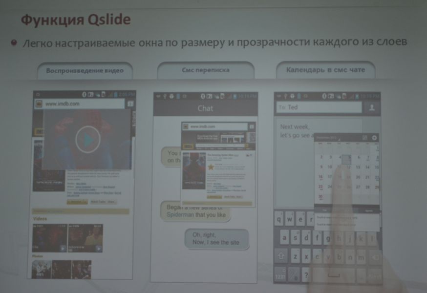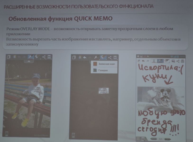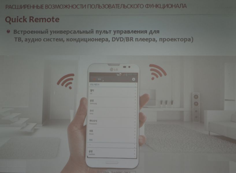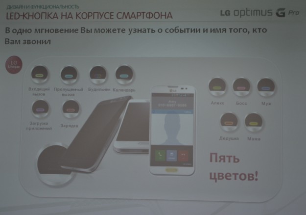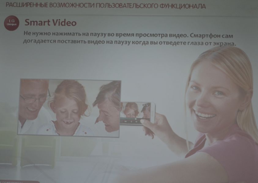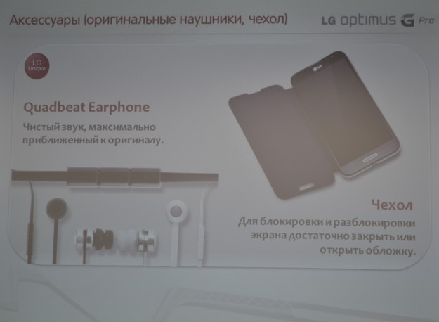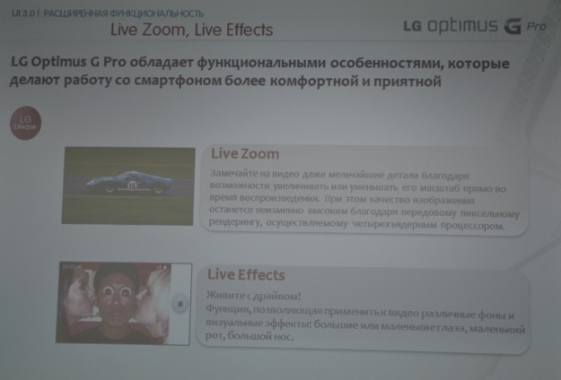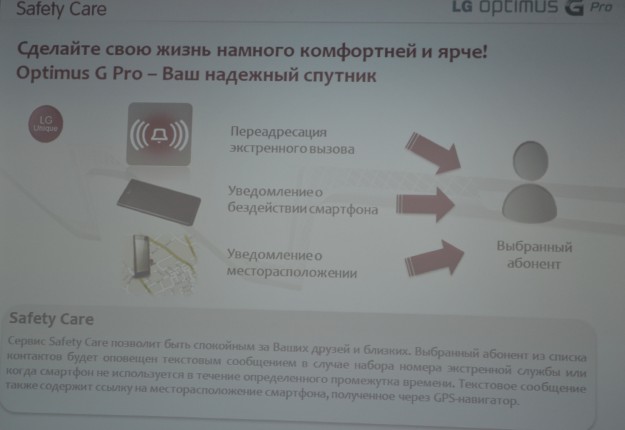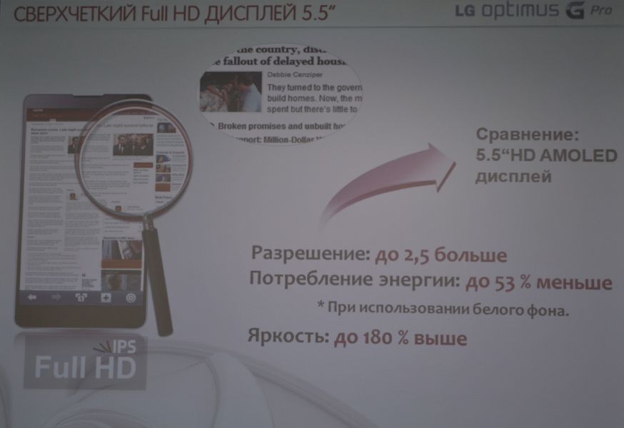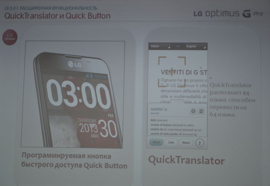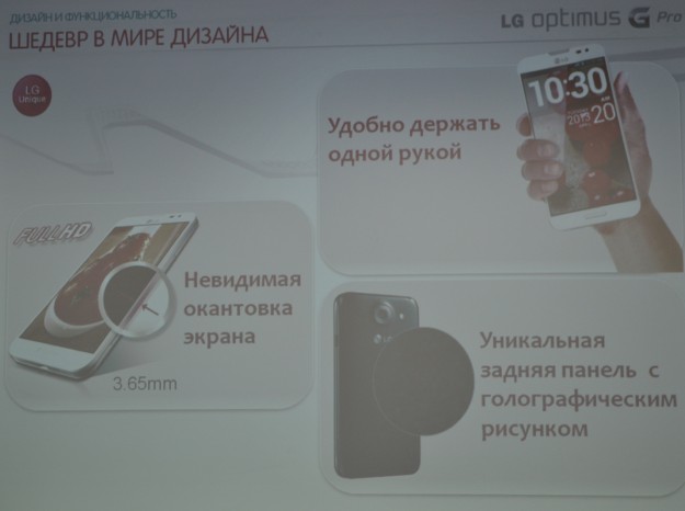 LG Optimus G Pro в Украине – краткий репортаж с презентацииВ прошлую пятницу украинский офис LG представил новый флагманский смартфон LG Optimus G Pro. Наши впечатления о новинке ниже. Презентация проходила в стенах киевского офиса компании. Помимо официальных лицна мероприятии собралось также несколько десятков представителей специализированных средств массовой информации и представители компании Rozetka. После небольшого вступительного слова президента LG Electronics Украина присутствующие смогли послушать детальный рассказ о модели и ее особенностях от продакт-менеджераLG Юлии Бесединой. Ниже несколько наглядных иллюстраций того, о чем шла речь. Также поведали и об аксессуарах, которые будут предлагаться к LG G Pro. После этого своим впечатлением от новинки поделились представители компании Rozetka Тарас Олейник и Николай Бриленко. Они также проинформировали присутствующих о том, что в ближайшие две недели анонсированный смартфон будет доступен на эксклюзивных правах в магазине Rozetka.ua по цене 5555 гривен. А вот в offline-рознице трубка появится через две недели, но будет почти на 500 гривен дороже – 5999 гривен. Словом, есть над чем задуматься! После официальных докладов, мнений, а также сессии «вопросы-ответы» присутствующие переместились к демо-стендам, где всем была предоставлена возможность познакомиться сновинкой ближе. Что понравилось и не понравилось на первый взгляд!? Лично мне кажется, что внешне трубкапроигрывает Optimus G (с обзором последнего знакомимся здесь). Да, трубка выглядит бойко, по-своему мощно, в некой мере стильно.… Но вместе с тем, давайте будем смотреть правде в глаза – G Pro выполнен в стилистике многих предшественников линейки L первого поколения и других моделей LG, чего не скажешь об G. Да, здесь есть уже знакомая нам по Optimus G зеркальная текстура и многие другие «мелкие новшества». Тем не менее, у G ненаследственная внешность, чего, увы, нельзя сказать об G Pro. Считать ли это минусом!? На мой взгляд, нет, хотя бы уже потому, что подобным грешит далеко не один производитель, за примерами далеко ходить не нужно, тот же S4 от «собрата» LG по родине компании Samsung. Много интересных функций. Да, к слову, я уверен в том, что наиболее бдительные наши читатели заметили на иллюстрациях выше одну интересную вещь - особенности ряда функций напоминают таковы у флагмана компании Samsung 2013 модельного года. Здесь, конечно, можно долго спорить о том, какой производитель, скажем так, заимствовал функции у другого, но есть одно «но» - мировая премьера Optimus G Pro состоялась раньше, чем S4, причем не на один день или два. Хотя, быть может, эти функции разрабатывала общая команда инженеров!? Ну да последнее, разумеется, только ирония. Дисплей больше не только в сравнении с G, но и тем же S4. Все технические моменты о дисплее уже сказаны выше. Лично мне его возможности очень понравились - нет и намека на «вымирание» или искажение информации. Тоже касается и зерна. Как он «ведет» себя в условиях работы в ярком солнечном окружении, в точности сказать трудно – на улицу я с ним не ходил, но уверен, что дела не плачевные уж точно. В отличие от G, новый флагман LG G Pro получил съемную крышку аккумуляторного блока. Хорошо это или нет!? Уверен, пользователю понравится уже с точки зрения удобства замены аккумулятора. Кстати о нем! Под крышкой G Pro аккумулятор, емкость которого 3140 мАч. Кроме того, в мен