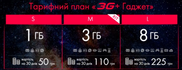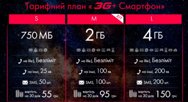 Все три пакета включают в себя неограниченное количество минут для разговоров внутри сети и предусматривает ежемесячную абонентскую плату. Тариф "S" стоимостью 55 грн предлагает пользователю 750 МБ данных, 50 бесплатных SMS и 25 минут для звонков на другие сети, "M" за 95 грн - 2 ГБ данных, 100 минут для звонков на номера других операторов плюс 100 SMS. Ну а для тех, кто одновременно активно звонит на все направления и пользуется мобильным Интернетом, предусмотрен тариф «L». Он стоит 150 грн, включает в себя 200 SMS, 200 минут для звонков на другие сети и целых 4 ГБ данных для использования в течение месяца. Отдельно был анонсирован тариф для планшетов и модемов - “3G+ Гаджет”.