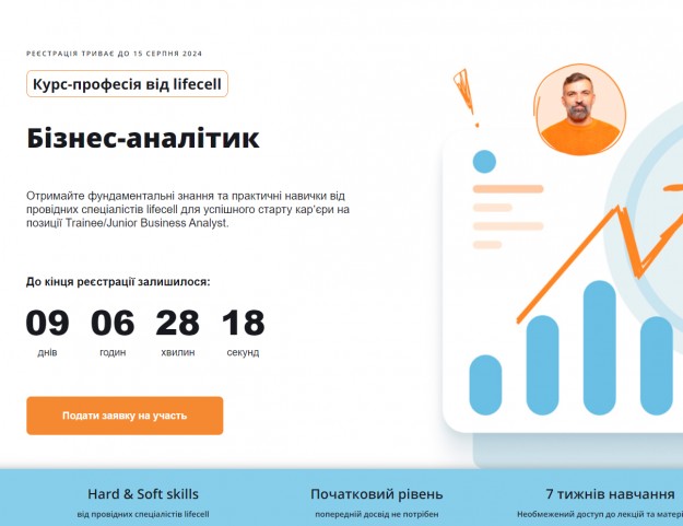 lifecell та Prometheus запускають курс «Бізнес-аналітик»Компанія lifecell спільно з командою освітньої платформи Prometheus розробили новий курс-професію «Бізнес-аналітик». За сім тижнів за підтримки провідних спеціалістів lifecell студенти опанують практичні навички та сучасні аналітичні інструменти для успішного старту кар’єри на позиції Trainee/Junior Business Analyst. Перший набір на навчання триває до 15 серпня.