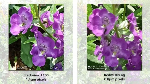 Blackview A100 Dual Pixel AF и VCM с обратной связью (слева) по сравнению с обычной технологией автофокусировки (справа) Благодаря сочетанию Dual Pixel AF и VCM с обратной связью Blackview A100 фокусируется всего за 0,03 секунды и имеет более высокую скорость непрерывной съемки - 10 кадров в секунду, что почти в три раза выше среднего показателя в своем классе. Это особенно полезно для съемки последовательностей действий, таких как катание на скейтборде, танцы и многое другое. Blackview A100 также можно использовать для съемки ваших энергичных домашних животных. Мегапиксель и размер пикселя Не имеет смысла делать выводы о том, у какого телефона лучше камеры, просто сравнивая мегапиксельные характеристики. Например, iPhone 12 оснащен камерой с относительно низким разрешением, но обеспечивает отличное качество изображения. То же самое и с A100, который имеет те же возможности камеры, что и iPhone 12. Blackview A100 оснащен основной камерой на 12 МП с датчиком Sony IMX362, а Redmi 10X 4G оснащен камерами на 48 МП с датчиком Samsung GM1. Так как же выбрать между ними? Согласно общедоступной информации, GM1 в этом телефоне Redmi представляет собой датчик изображения 48MP, но с выходом 12Mp, а размер пикселя составляет 0,8 мкм. GM1 с технологией тетрапикселей имитирует большие пиксели для получения более ярких снимков за счет использования структуры пикселей Quad Bayer, которая может объединять четыре пикселя 0,8 мкм один за другим.