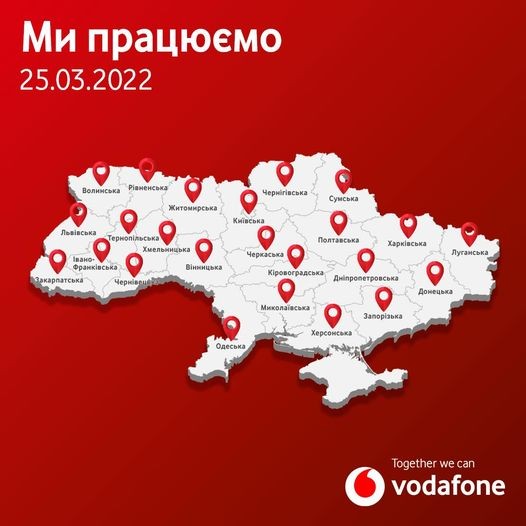 Магазини Vodafone працюють: 287 магазинів у всіх 24 областях УкраїниНа сьогодні відкрито 287 магазинів у всіх 24 областях України. Та на цьому ми не зупиняємось й далі продовжуємо працювати над відновленням роботи там, де це безпечно і для наших клієнтів, і для співробітників. Також підсилюємо торгові точки на заході країни, адже туди перемістилася велика кількість наших громадян.