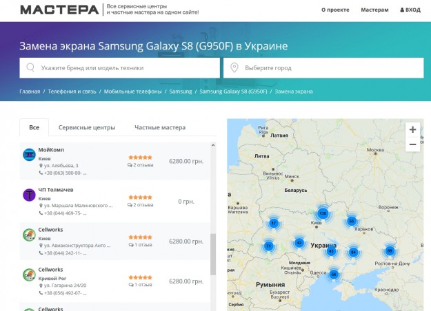 Выбираете модель своего гаджета, поломку и необходимую работу – получаете список предложений с выводом локации и цены. Отдельно список можно разделить на сервисные центры и частных мастеров. После этого смотрите контакты, созваниваетесь-списываетесь, а после выполнения работы по желанию оставляете отзыв.