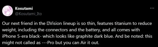 У наступному дописі Kosutami уточнив, що Vision Air, як і раніше, використовуватиме алюміній на більшій частині зовнішньої «опівнічно-чорної» поверхні, а титан застосовуватиметься при виготовленні внутрішніх вузлів для зниження ваги. Він також опублікував зображення нового роз'єму для Vision Air, який помітно більший за стандартний Lightning.