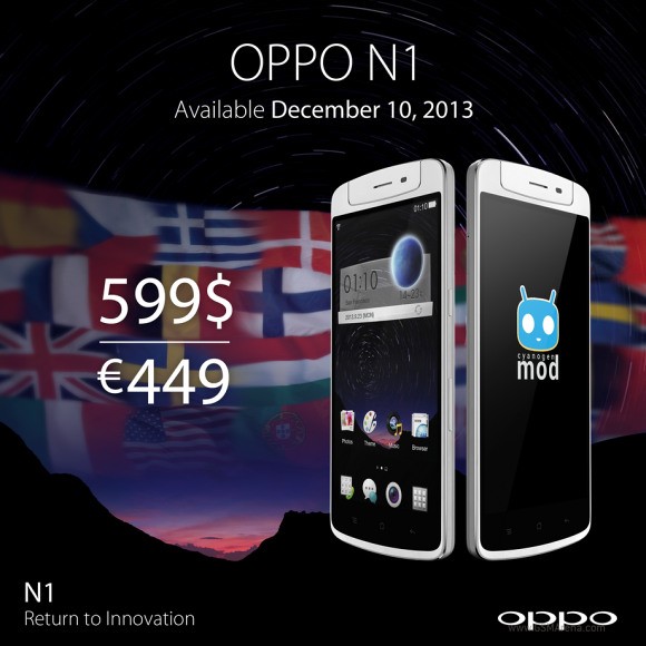 Международную версию камерофона Oppo N1 представят 10 декабряКомпания Oppo на своих страницах в социальных сетях сообщила о том, что релиз международной версии ее флагманского смартфона Oppo N1 состоится 10 декабря. Стоимость аппарата составит $599 или же 449 евро. Напомним, Oppo N1 оснащен 5.9-дюймовым IPS Full HD дисплеем, 4-ядерным чипом семейства Snapdragon 600 с тактовой частотой 1.7 ГГц и графикой Adreno 320, 2 ГБ ОЗУ и 16/32 ГБ ПЗУ, батареей емкостью 3160 мАч, модулями Wi-Fi 802.11ac с технологией Wi-Fi Direct, Bluetooth 4.0, NFC и GPS.