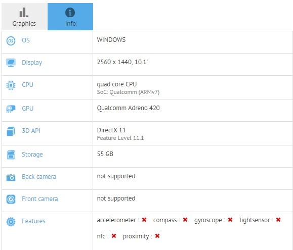 Microsoft готовит к анонсу Windows-планшет с QHD-дисплеемВ базе данных бенчмарка GFXBench был замечен не представленный еще официально Windows-планшет корпорации Microsoft с 10.1-дюймовым QHD-дисплеем.