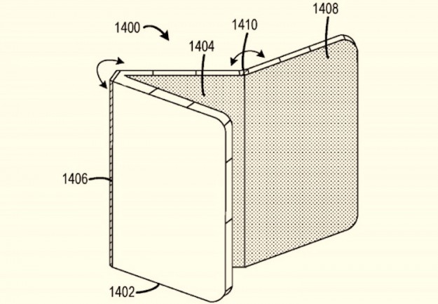 Патент был выдан Управлением по патентам и товарным знакам США на прошлой неделе. Он содержит эскиз устройства, с двумя шарнирами и одним большим экраном, состоящим из трёх отдельных секций. В сложенном виде устройство может использоваться как традиционный смартфон. Его форма напоминает существующие устройства серии Surface Duo.