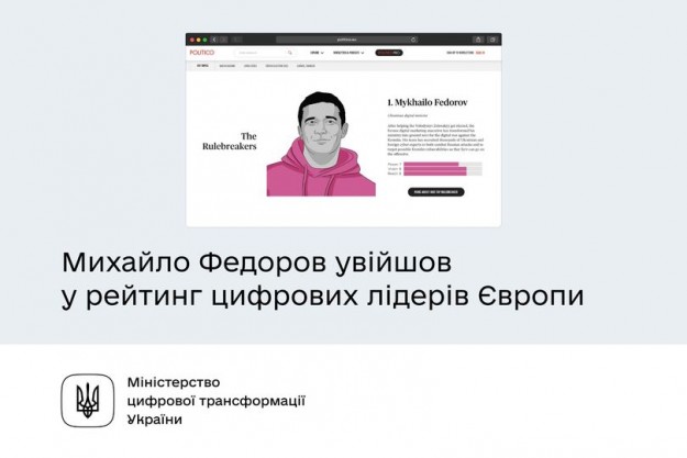 Михайло Федоров увійшов у рейтинг цифрових лідерів Європи POLITICO Tech 28Віцепрем'єр-міністр — Міністр цифрової трансформації України Михайло Федоров потрапив у шортлист та посів перше місце в категорії Rulebreakers: https://www.politico.eu/tech-28-2022/. Tech28 — новий рейтинг американського видання Politico, який включає 28 найважливіших персон, що стоять за технологічною революцією у Європі. У цей список вже встигли потрапити Даніель Ек (Spotify), Хелле Торнінг-Шмідт (Facebook), Патрік та Джон Коллісони (Stripe) та інші техреформатори.