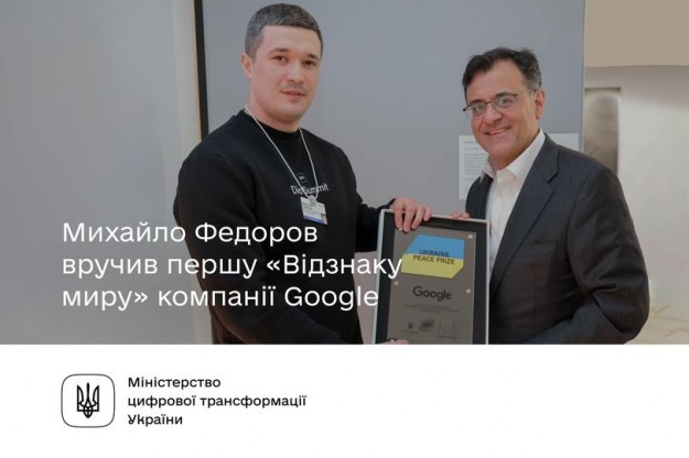 Михайло Федоров вручив першу «Відзнаку миру» компанії GoogleЦе перша компанія, яка отримала нагороду від України, що запровадив Президент Володимир Зеленський. «Відзнаку миру» вручив Михайло Федоров Віцепрезиденту Google Карану Бхатія під час зустрічі в Давосі у межах Міжнародного економічного форуму.