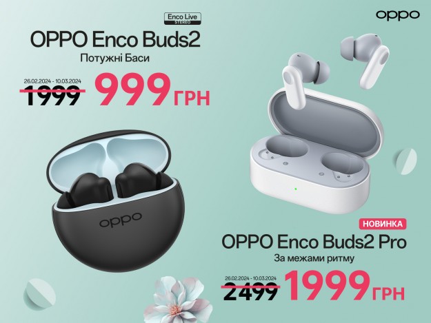 Нові бездротові навушники OPPO Enco Buds2 Pro оснащені 12,4-мм драйверами надвеликого розміру, а титанована вібраційна діафрагма забезпечує поліпшену жорсткість і кращу віддачу. Функція Enco Master Equalizer з трьома звуковими профілями: Збалансований, Бас і Динамічний, Enco Buds2 Pro робить навушники надзвичайно багатогранними. Ще одна перевага навушників Enco Buds2 Pro — чудове поєднання двох мікрофонів і алгоритмів шумозаглушення зі штучним інтелектом, що також сприяє оптимальному прослуховуванню. А завдяки Bluetooth 5.3 насолоджуйтеся синхронізованим відтворенням із низькою затримкою 94 мс, що ідеально підходить для ігор та перегляду фільмів. З Enco Buds2 Pro ви можете прослуховувати музику до 8 годин на одному заряді або розмовляти до 4 годин. Додайте до цього потужний зарядний кейс, і час автономної роботи Enco Buds2 Pro збільшиться до 38 годин відтворення музики та 20 годин у режимі розмови. Enco Buds2 Pro мають захист від пилу та води за стандартом IP55. Звичайна ціна 2 499 грн —-- Акційна ціна (26/02-10/03) 1 999 грн Молодша модель ОРРО Enco Buds2 коштуватиме 999 грн замість 1 999 грн в період з 26/02 по 10/03.