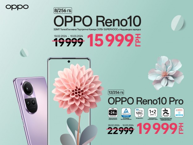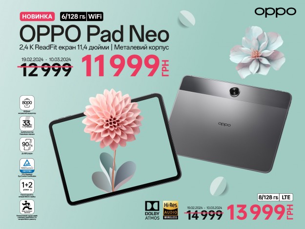 Новинку, планшет OPPO Pad Neo (6/128 Гб), також можна придбати за святковою знижкою. Планшет працює на операційній системі Android 13 з оболонкою ColorOS 13.2. Завдяки провідному в галузі 11,4-дюймовому ReadFit дисплею з частотою оновлення 90 Гц, роздільною здатністю 2.4K та співвідношенням сторін 7:5, чотирьом динамікам з технологією Dolby Atmos®, тривалій автономній роботі, а також набору розумних і зручних функцій для підключення різних пристроїв, OPPO Pad Neo забезпечує відмінні можливості для розваг з винятковим комфортом, яким користувачі можуть насолоджуватися протягом усього дня. Живить OPPO Pad Neo динамічна комбінація підтримки швидкого заряджання SUPERVOOC 33 Вт і великого акумулятора ємністю 8 000 мАг, що забезпечує швидку підзарядку і тривале використання протягом усього дня. Крім того, планшета вистачить на неймовірних 514 годин роботи в режимі очікування. Великого об'єму пам'яті у 128 Гб вистачить для зберігання всіх важливих файлів та мультимедіа. Розширюйте місткість сховища, додатково встановлюючи карту microSD до 1Тб та отримайте ще більше простору для фото, відео та файлів. До того ж, планшет має функцію розширення RAM до 16 ГБ за допомогою технології OPPO RAM Expansion. Звичайна ціна 12 999 грн —-- Акційна ціна (19/02-10/03) 11 999 грн Старша модель ОРРО Pad Neo (8/128 Гб) коштуватиме 13999 грн замість 14 999 грн у період з 19/02 по 10/03. Також у акції приймають участь й багато інших моделей гаджетів ОРРО, як-от: