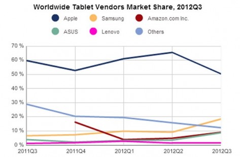 Мировые продажи планшетов выросли на 6,7% в 3 квартале 2012 года, при этом доля рынка компании Apple сократилась до 50,4%, сообщает IDCПо данным международной компании IDC за третий квартал 2012 года мировой рынок планшетов вырос на 6,7% и на 49,5% по сравнению с аналогичным периодом прошлого года. На компанию Apple приходилось более половины из 27,8млн мировых продаж планшетов, но в третьем квартале компания потеряла значительную часть рынка. Ее доля сократилась до 50,4% с 65,5%, которые приходились на второй квартал 2012 года. IDC объясняет это тем, что потребители удерживались от покупок устройств компании Apple до выхода на рынок Ipad mini. Тем не менее, из-за относительно высокой начальной стоимости Ipad mini в размере $ 329, ожидается, что планшетам на операционной системе Android потребители отдадут большее предпочтение. Компания Samsung стала второй в списке лидеров, она продала более пяти миллионов планшетов и увеличила свою долю на рынке до 18,4%, в основном за счет продаж Galaxy Tab 10,1 и Note 10.1. Amazon и ASUS также имели стабильные продажи в этом периоде благодаря реализации Kindle Fires and Nexus 7, соответственно. Благодаря присутствию компании Lenovo на китайском рынке, компания замкнула пятерку лидеров, со скромным ростом показателей продаж по сравнению с аналогичным периодом прошлого года.