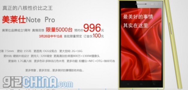 Mlais Note Pro — новый 8-ядерный фаблет стоимостью $160Китайская компания Mlais официально представила новый 8-ядерный фаблет Note Pro толщиной 7.2 мм. Аппарат своим техническим оснащением во многом напоминает представленный на прошлой неделе Xiaomi Redmi Note. Он оснащен 5.5-дюймовым дисплеем с разрешением 1280х720 пикселей, 8-ядерным процессором Mediatek MT6592 с тактовой частотой 1.7 ГГц и графикой Mali 450, 2 ГБ оперативной памяти и 16 ГБ внутренней.