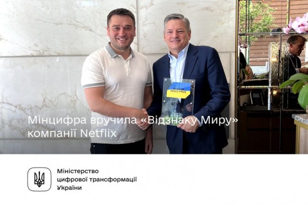 Мінцифра вручила «Відзнаку Миру» компанії NetflixКоманда Мінцифри зустрілася зі спів-СЕО Netflix Ted Sarandos, щоб вручити «Відзнаку Миру». Це нагорода, ініційована Президентом України Володимиром Зеленським для компаній та корпорацій, урядів, посадовців і світових політиків за активну підтримку України.