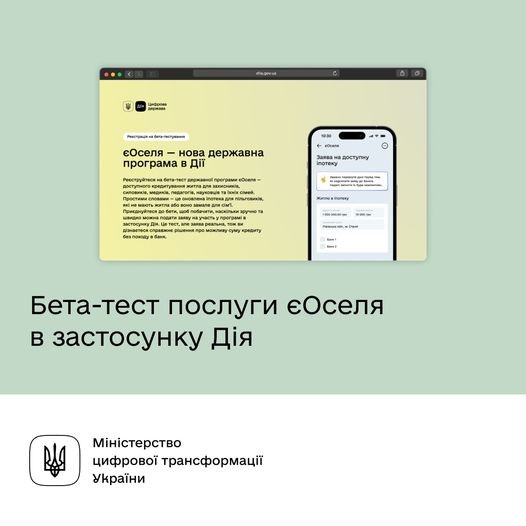 Міністерство цифрової трансформації України: Тестуємо послугу єОселя в застосунку ДіяЧерез повномасштабне вторгнення росії багато українців залишилися без домівок. Саме тому вже зараз держава пропонує вигідні умови для купівлі житла за програмою пільгового державного кредитування. Долучайтеся до бета-тестування послуги єОселя в застосунку Дія.