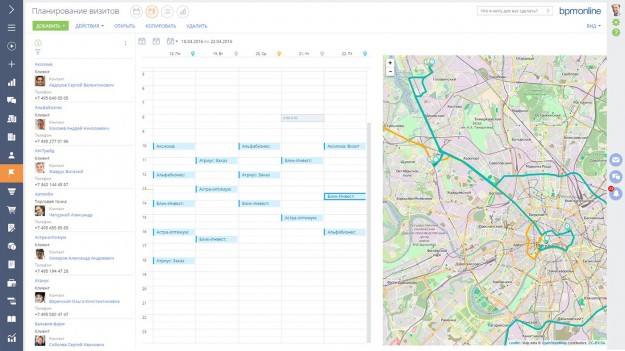 Мобильные версии CRM систем оснащены полным функционалом для управления полевыми продажами. Торговые представители получают доступ к базе клиентов и рабочему расписанию, могут просмотреть каталог продуктов и базу знаний, имею доступ к списку заказов и договоров. Маршрут каждого визита к клиенту планируется заранее по карте, система может подсказывать необходимые действия во время общения с клиентом, помогает в подборе продуктов и в принятии заказов на основе предыдущих заказов конкретного клиента. В то же время руководители отдела продаж или супервайзеры смогут через систему закрепить торговых представителей за определенным районом, составить расписание визитов в торговые точки на месяц вперед и контролировать выполнение задач.