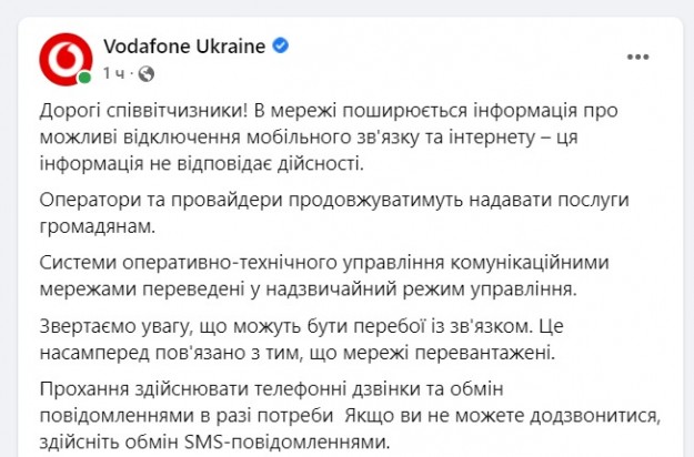 Мобильный оператор Vodafone Украина - обращение к клиентам. КонтактыДорогие соотечественники! В сети распространяется информация о возможных отключениях мобильной связи и интернета – эта информация не соответствует действительности. Системы оперативно-технического управления коммуникационными сетями переведены в чрезвычайный режим управления. Обращаем внимание, что могут возникнуть перебои со связью. Это прежде всего связано с тем, что сети перегружены. Просьба совершать телефонные звонки и обмен сообщениями в случае необходимости Если вы не можете дозвониться, выполните обмен сообщениями SMS. Контакты оператора: