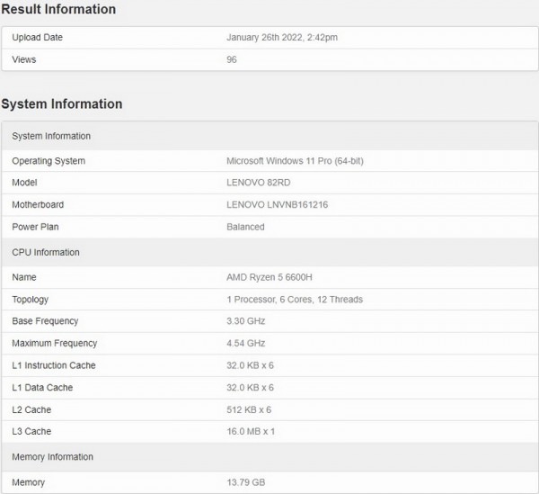Диапазон рабочих частот Ryzen 5 6600H составляет от 3,3 до 4,5 ГГц. В ходе тестов Geekbench чип автоматически разгонялся до 4527 МГц. Процессор тестировался в составе лэптопа Lenovo серии 82XX. Напомним, что днём ранее в составе этой же системы в том же тесте принимал участие более производительный Ryzen 9 6900HX той же серии Rembrandt, который оказался значительно быстрее модели Ryzen 9 5900HX предыдущего поколения, но не смог догнать флагманскую модель Intel Core i9-12900H серии Alder Lake-P.